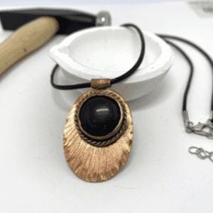 Elevate your accessory collection with our alluring Copper Fan Necklace featuring Black Sparkle Agate. This stunning piece showcases a unique fan-shaped copper pendant that beautifully complements the deep, shimmering allure of black agate stones. Each element is carefully selected to create a harmonious balance of modern elegance and timeless charm. Perfect for any occasion, this necklace adds a touch of sophistication and intrigue to your ensemble. Stand out with this exquisite piece that is sure to captivate and impress.