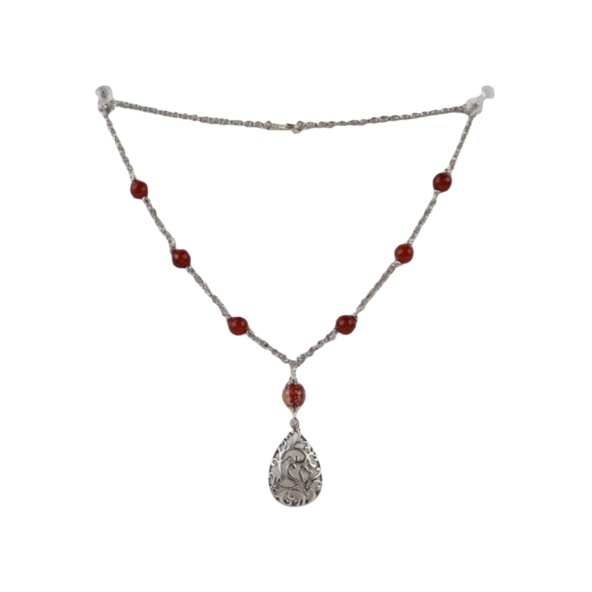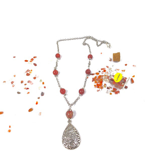Experience the striking beauty of our Water drop pendant featuring carnelian bead necklace. Crafted with a lead free and nickel free zinc alloy and completed with a durable stainless steel rolo chain.
