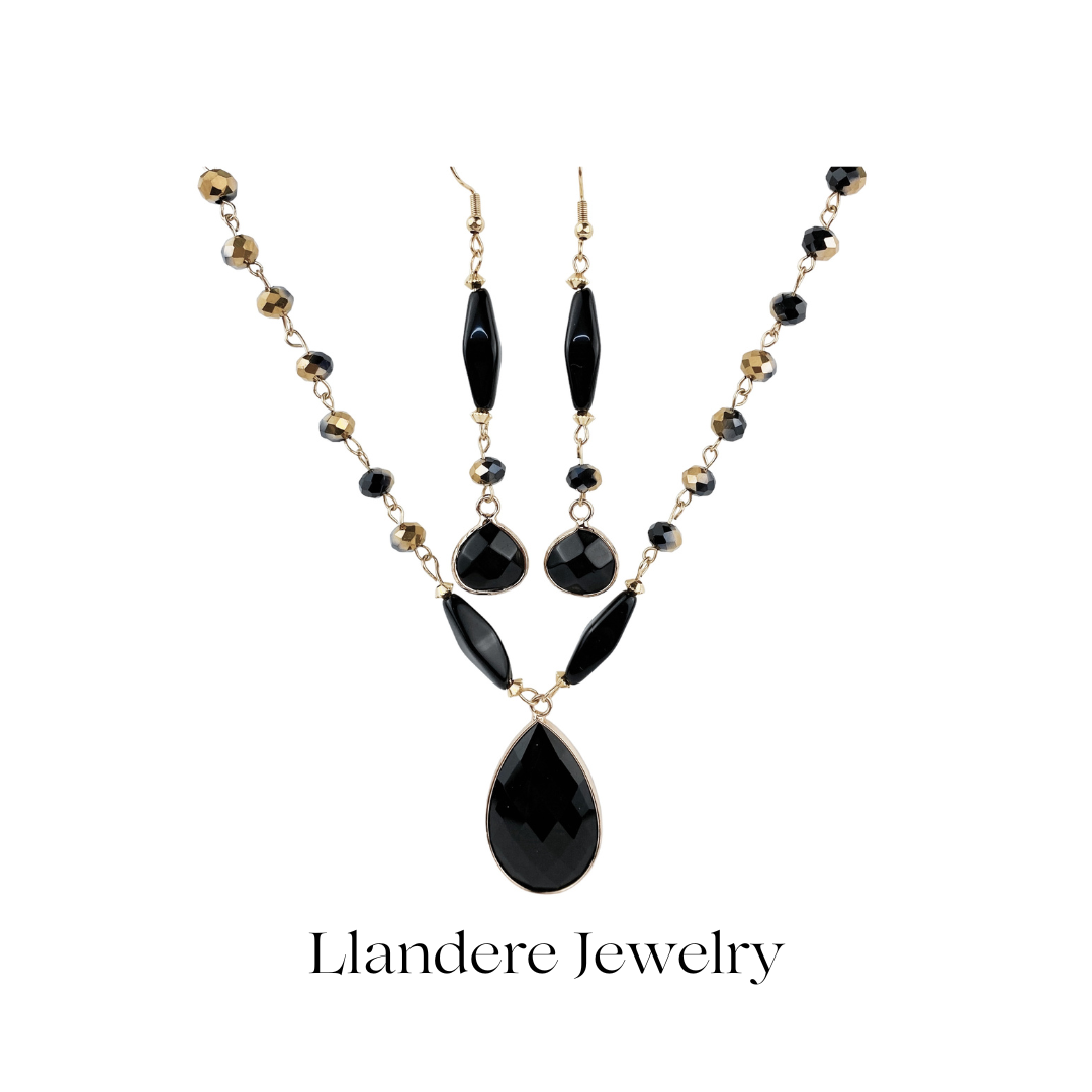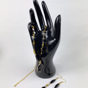 Immerse yourself in the timeless elegance of our Black Onyx Necklace and Earring set, designed to add a touch of sophistication to any ensemble. The set is handcrafted with beautiful black onyx arranged in a captivating design, married perfectly with radiant Czech beads. The Gold coated wire provides a warm, luxurious contrast to the onyx's deep hue, adding an extra hint of sparkle to this stunning accessory set. Handcrafted , this set captures the essence of artisan jewelry, combining design innovation and quality materials. The necklace lays gracefully against your neckline, while the earrings dangle delicately, enhancing your natural grace and beauty.