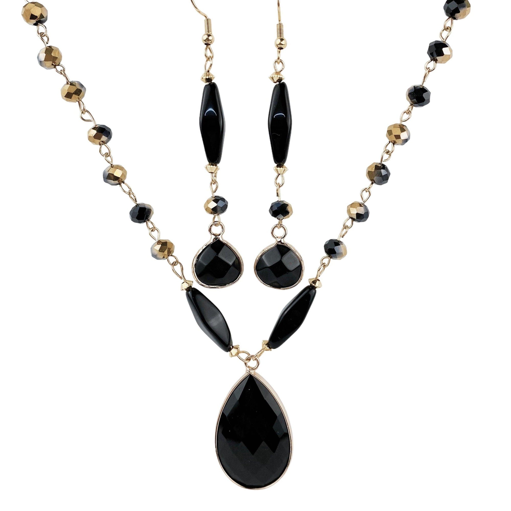 Black onyx Czech bead necklace and earring set 14K